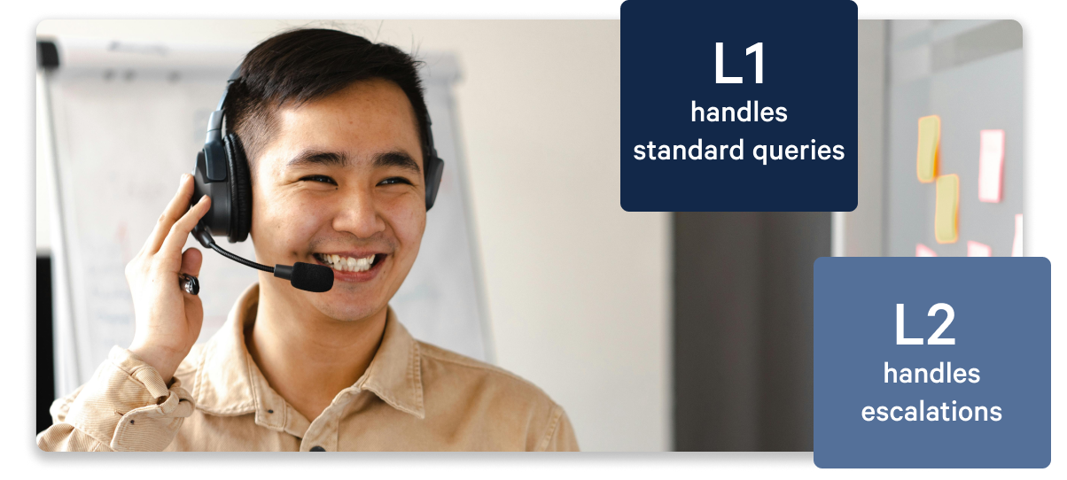 L1 handles standard queries end-to-end. L2 handles escalations—cases that need deeper investigation or back-office action. The tier boundaries are defined in writing, including what each tier can and can't action.