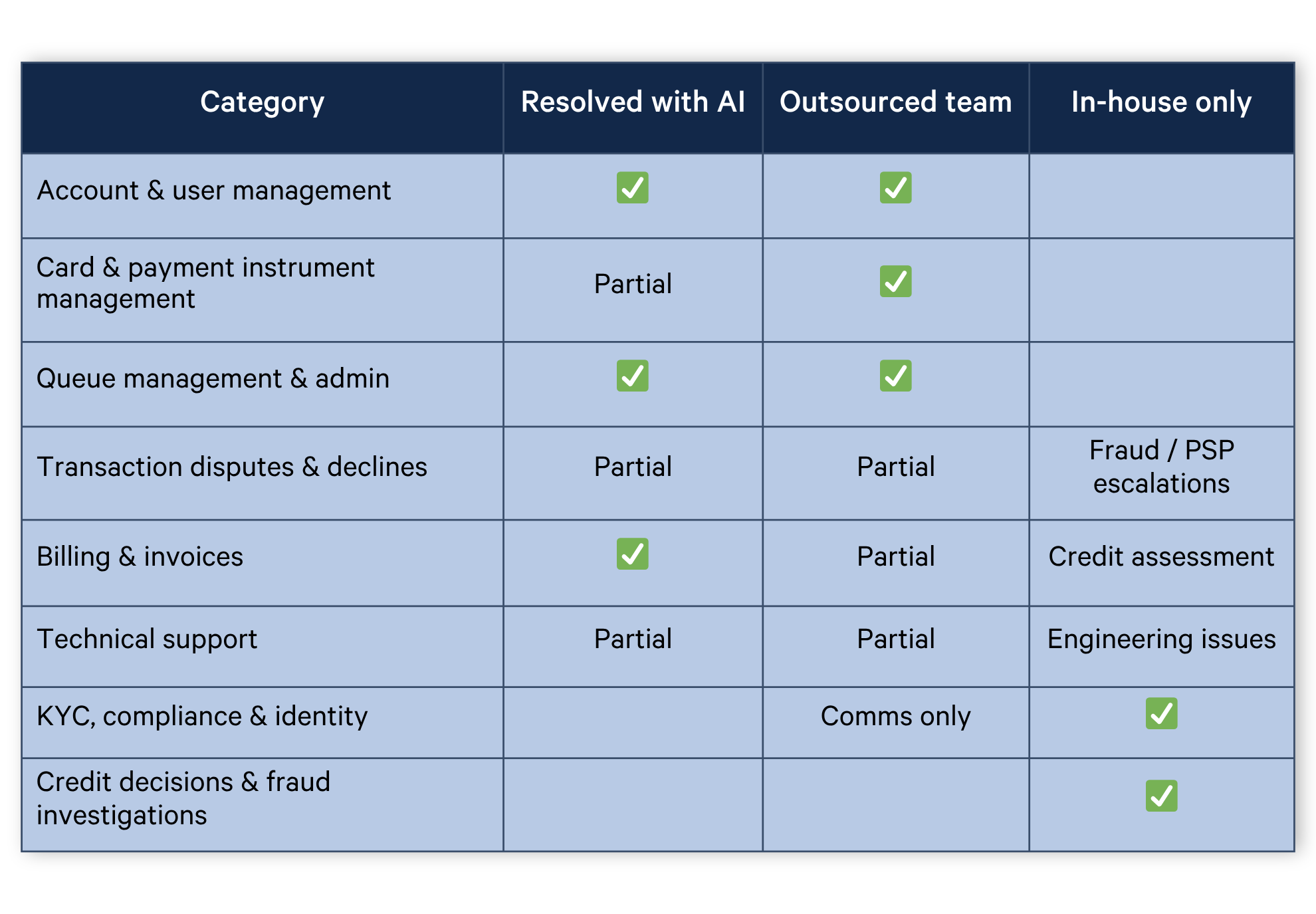- Transaction disputes and declines — standard diagnosis (limit exceeded, wrong PIN, invalid product) is fully outsourceable. Cases that require escalating to a payment service provider or involve suspected fraud need a clear handoff to in-house.