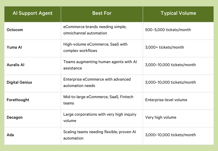 Below is a short summary of the top 7 customer support AI agents on our list. We also cover each one in-depth in the next section to help you make the best choice for your needs.